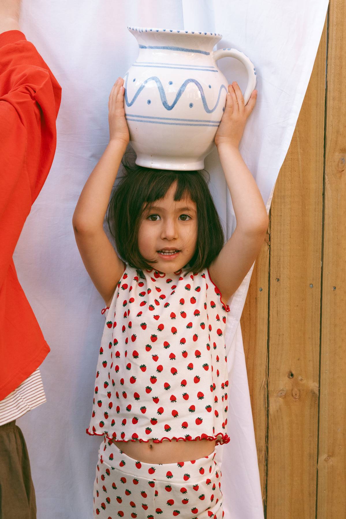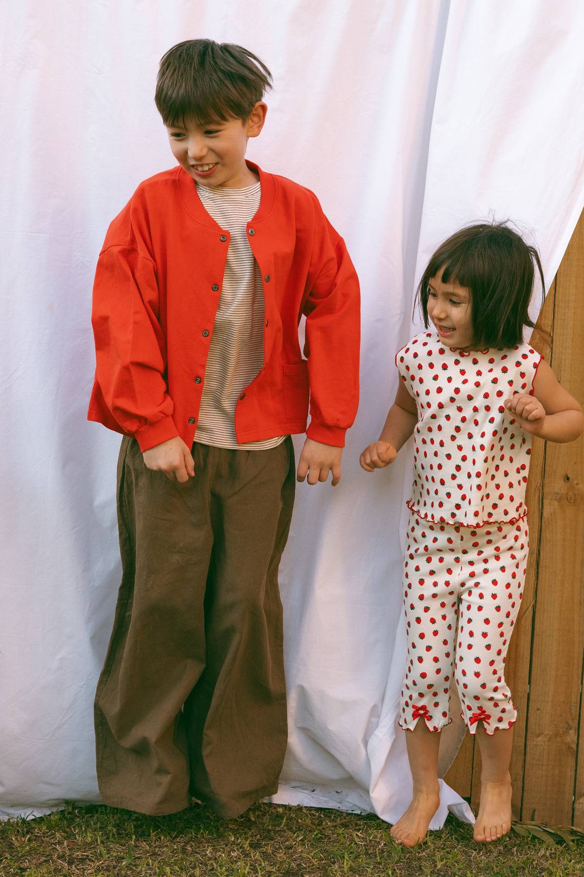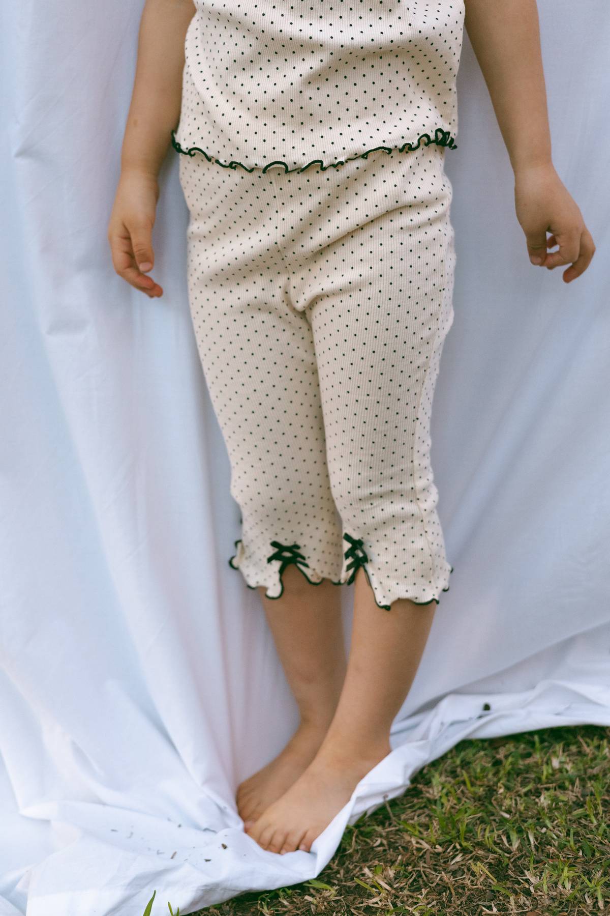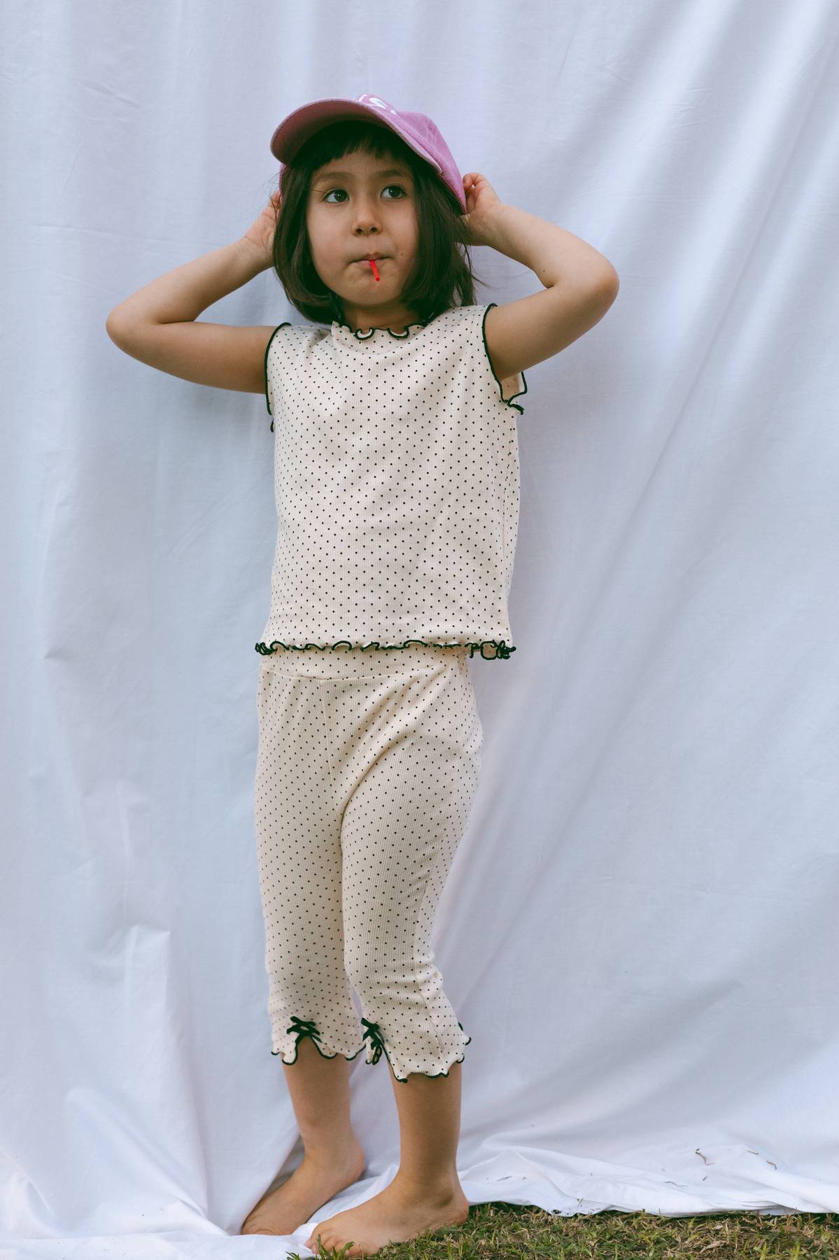 100% ribbed cotton. Frilled edge. True to size. Athena is almost five and wearing size 2XL.